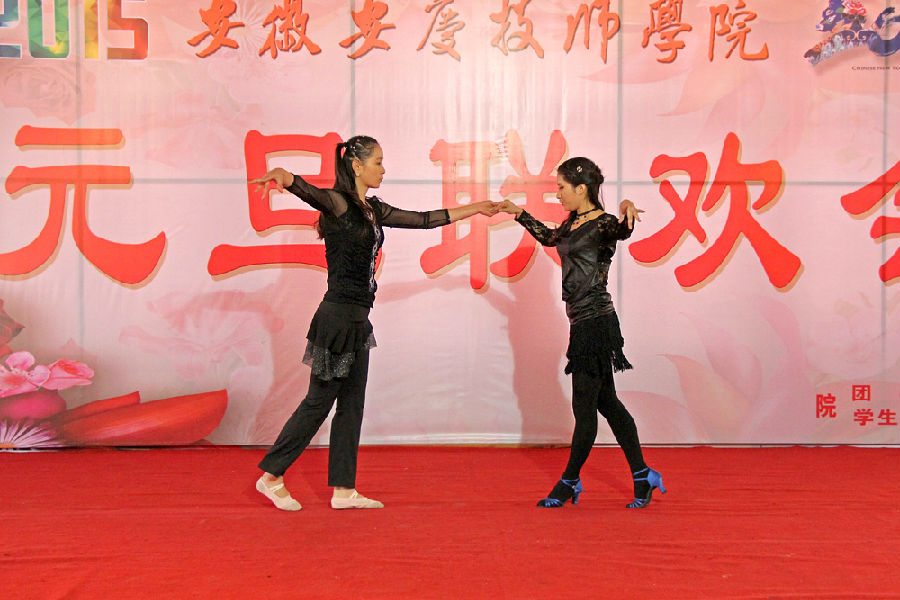 2014年12月30日下午安徽安庆技师学院2015年元旦联欢会在学院举行,学院分管领导朱清代表学院党委和行政班子向全体教职工和同学们表达了新年的祝福。联欢会在《好运来》的舞蹈中拉开帷幕,由老师组成的评委团评出《欢快地跳》、《月半小夜曲》、《战台风》分别荣获舞蹈类、歌曲类、才艺类第一名。