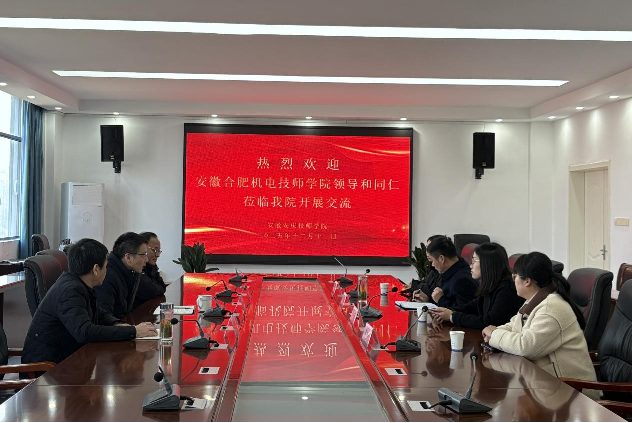 2025年12月11日上午,安徽合肥机电技师学院副院长蒋英发、院长助理陈亚蕾等一行四人赴我院开展交流学习。学院党委副书记、院长徐英武,党委委员、副院长徐波,教务处处长鲁新建参加座谈会。